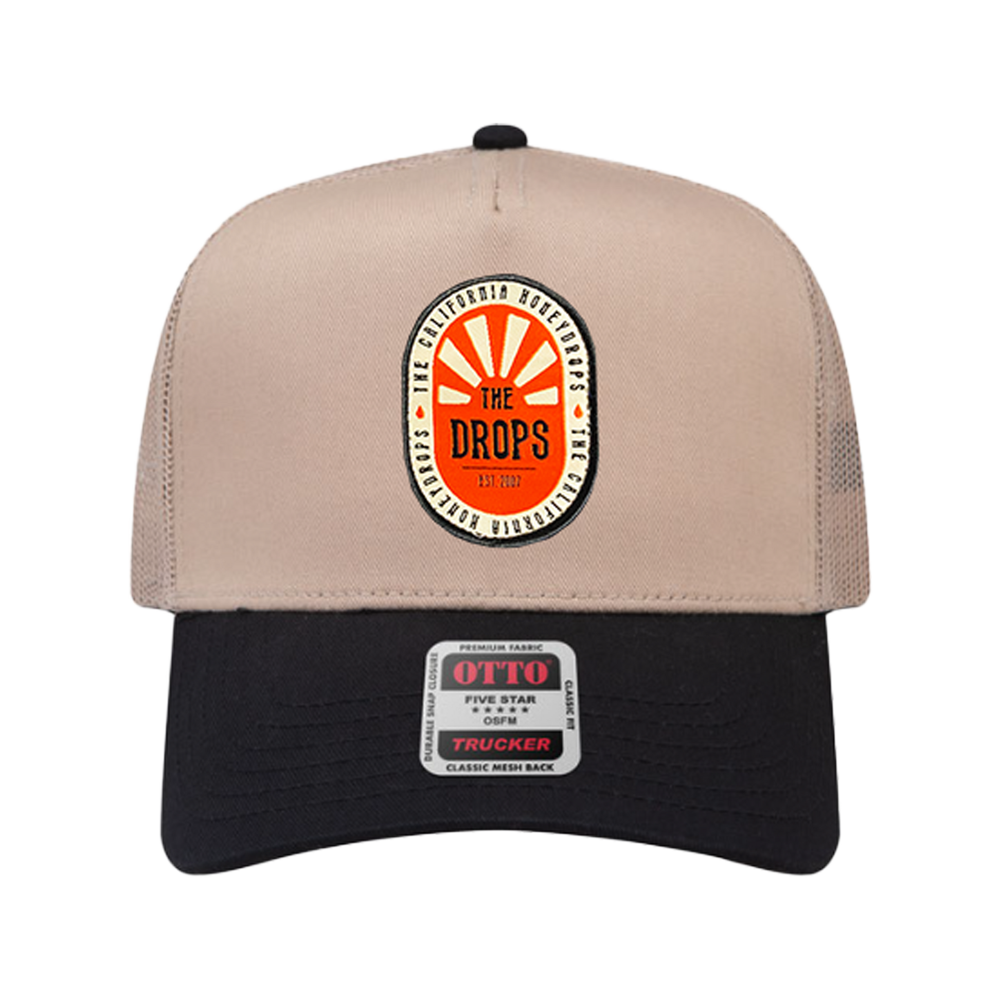 A classic two-tone trucker hat featuring our signature Sunburst patch, wrapped with “The California Honeydrops.” Finished with a breathable mesh back and a bold, vintage-inspired look.